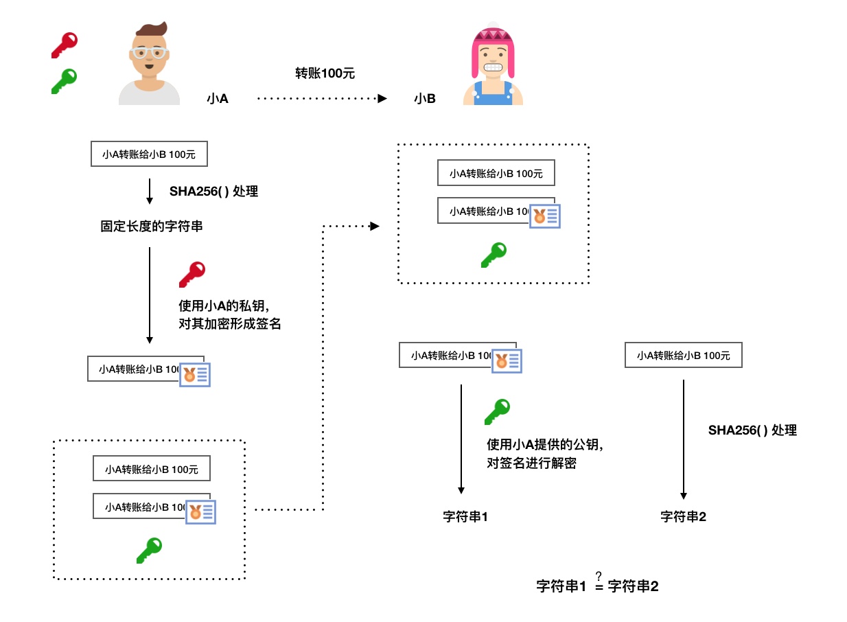 第四步:当小B收这三样东西,首先会将明文的小纸条进行SHA256()处理,得到一个字符串,我们将其命名为“字符串2”。然后,小B使用小A公布的公钥,对发过来的数字签名进行解密,得到另外一个“字符串1”。通过比对“字符串1”和“字符串2”的一致性,便可充分证明:小B接受到的小纸条就是小A发出来的小纸条,这张小纸条在中途没有被其他人所篡改;且这张小纸条确实是由小A所编辑。